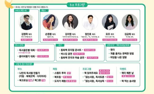 이 밖에도 행사 기간에는 ▲잔디 위 독서라운지 ▲책과 연계한 체험 및 이벤트 ▲북토크 작가 강연 ▲영화 상영 등 이천의 지역 자원을 살린 다채로운 프로그램이 운영될 예정이다. 행사 관련 자세한 내용은 이천시 도서관과(031-644-4352)로 문의하면 된다.
