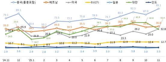 • 중국·베트남·미국·EU·대만 증가…인도는 역성장